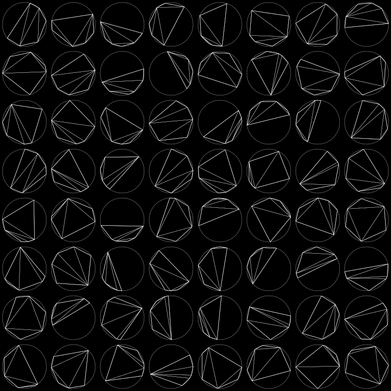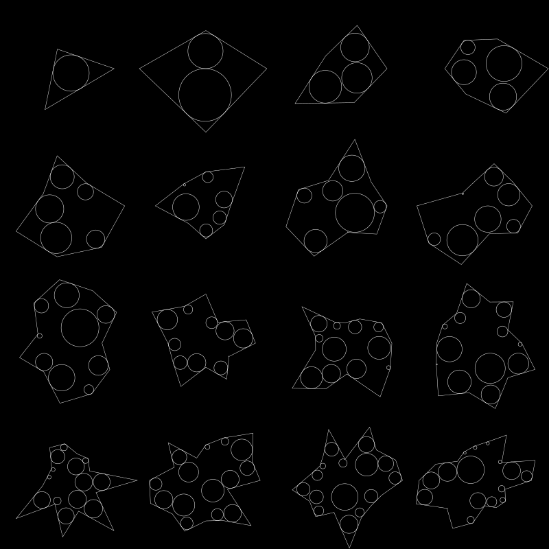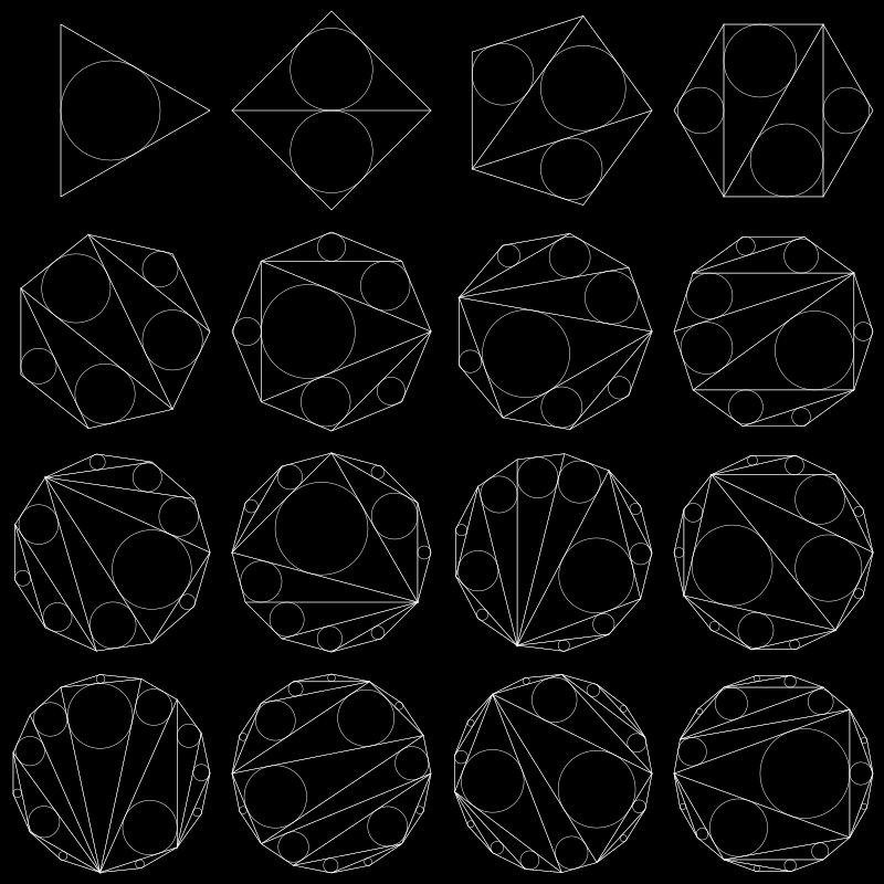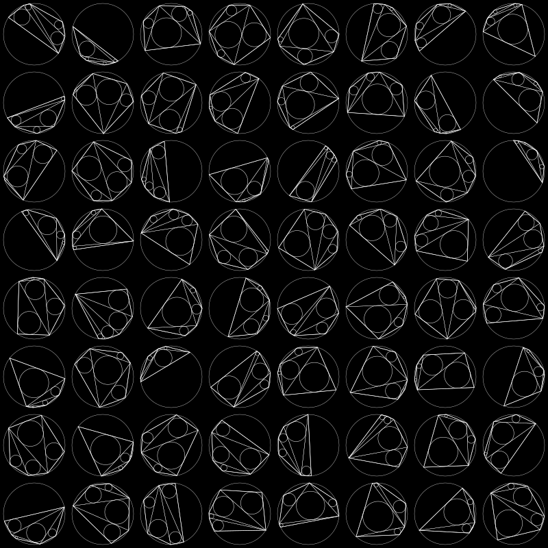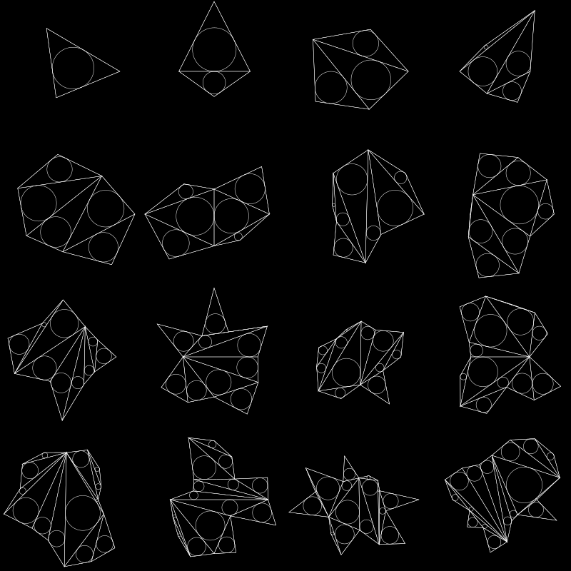 Random polygons, triangulated, only showing incircles, connected by webs.