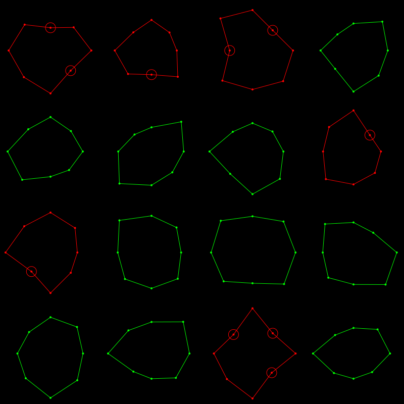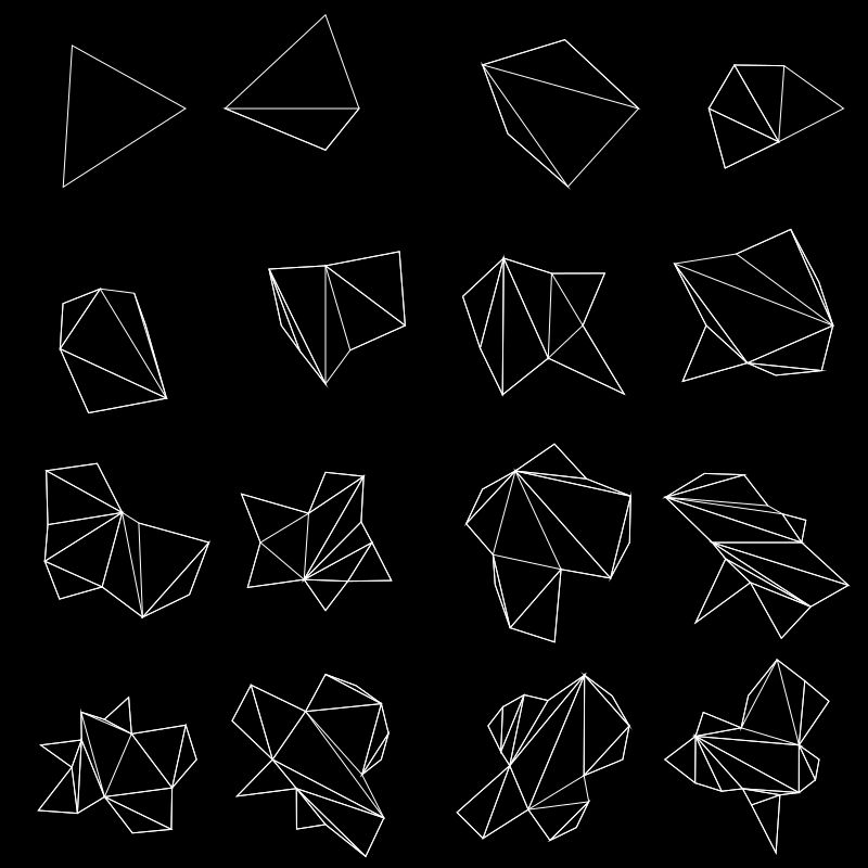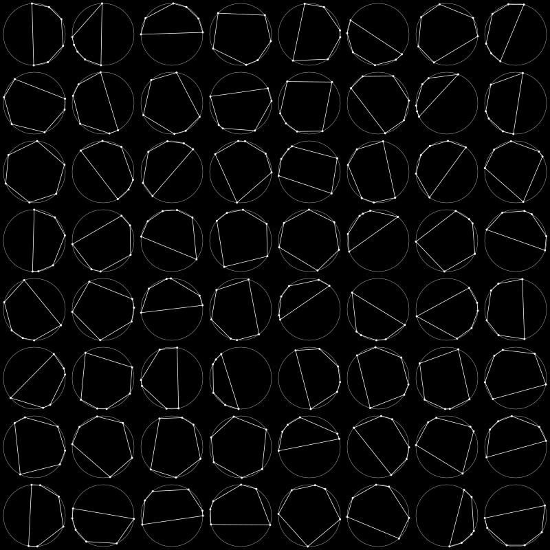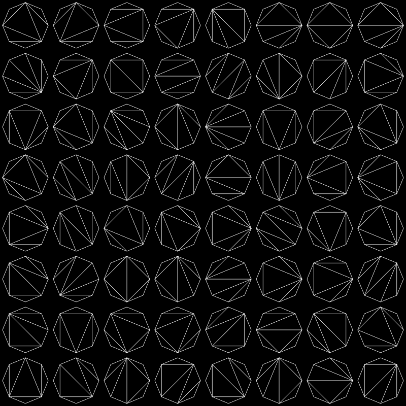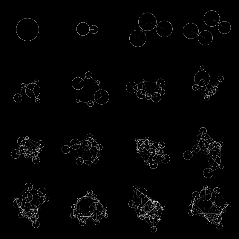 Random polygons, triangulated, only showing incircles, connected by webs.